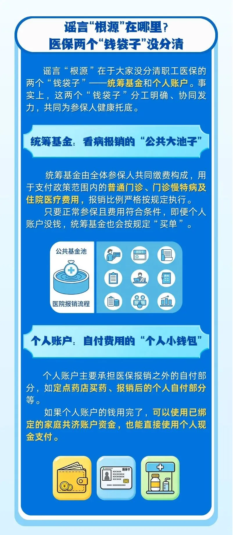 谣言“根源”在于大家没分清职工医保的两个“钱袋子”——统筹基金和个人账户。事实上,这两个“钱袋子”分工明确、协同发力,共同为参保人健康托底。